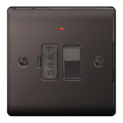 BG Electrical Accessories Nexus Metal 13 Amp Switched Fused Connection Unit with Neon NBN52 Switched Spur with Neon 13Amp Rating Black Nickel With No Visible Inserts Dimensions - 86 x 86 x 28.8mm Integral Gasket for Moisture Protection Colour Coded Screws Minimum Mounting Box Depth - 35mm BS 1363 Part 4